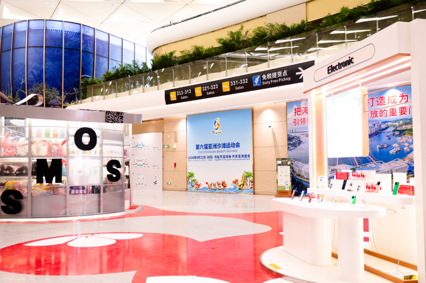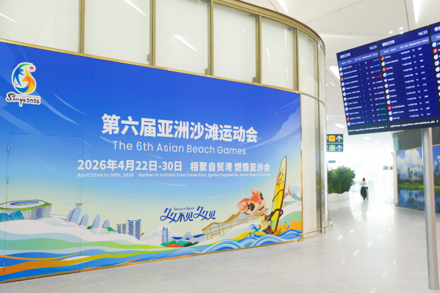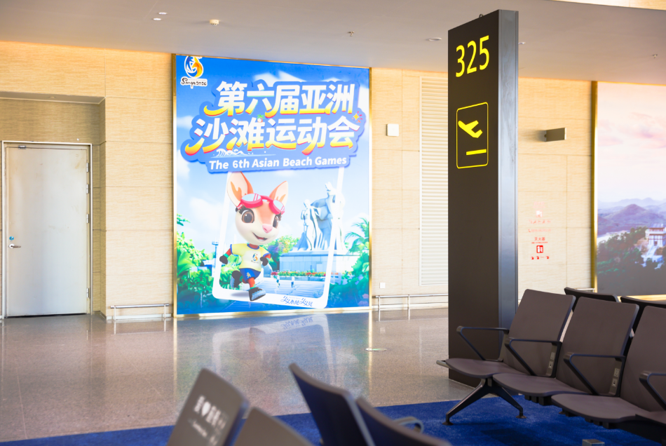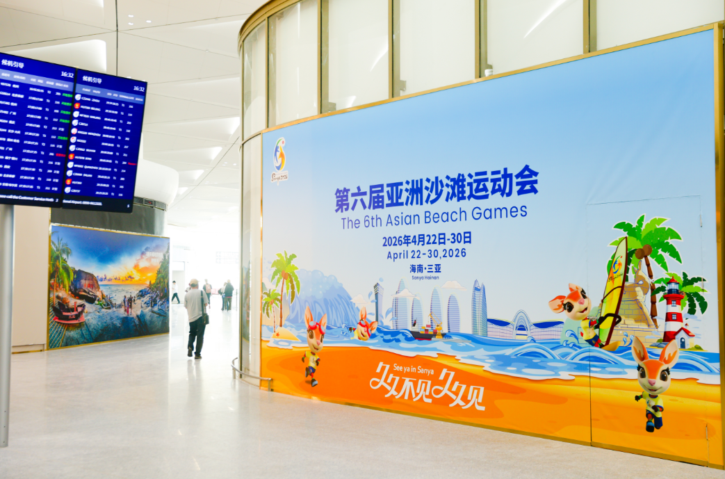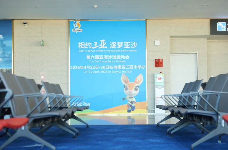 Posters of the 6th Asian Beach Games Sanya 2026 are displayed throughout the new terminal, making it a new Games-themed hotspot.