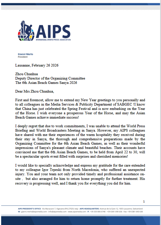 In the letter, AIPS President Gianni Merlo extended his Chinese New Year greetings to SABGOC's Publicity and Media Services Department. He appreciated the warm reception and careful planning during the World Press Briefing and the World Broadcasters Meeting for Sanya 2026. Merlo also expressed deep appreciation for SABGOC's hospitality and professionalism. Furthermore, he praised the thorough planning and smooth management of the Games’ media operations, highlighting that the detailed arrangements and attentive services made a positive and lasting impression on the media representatives present.