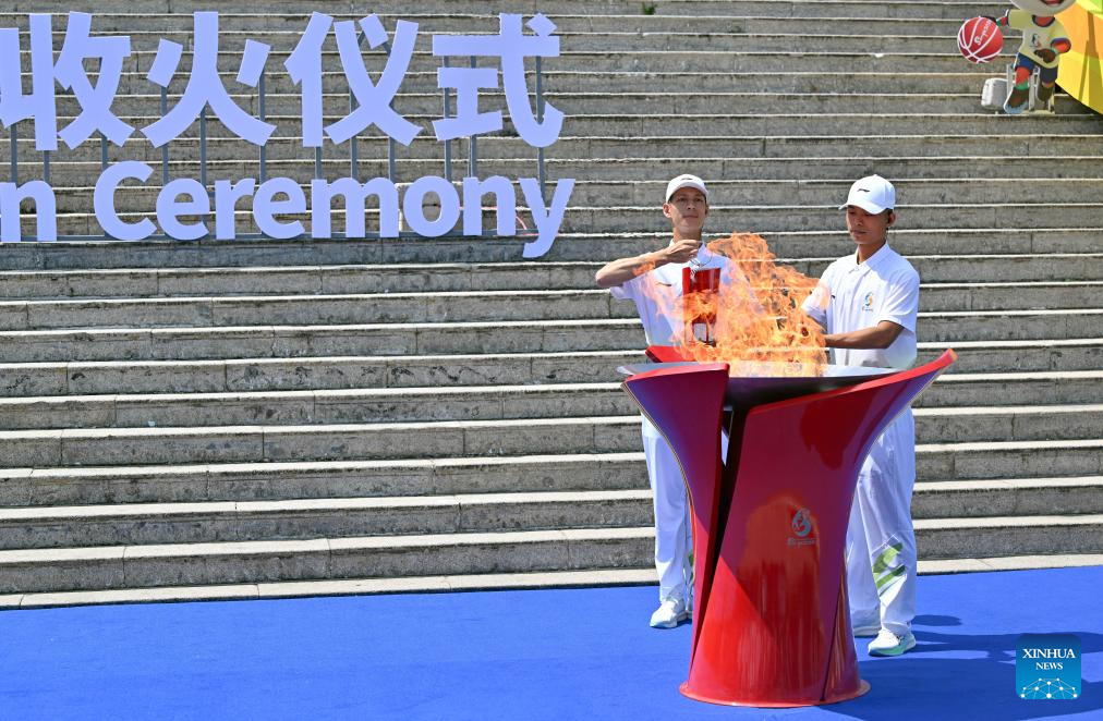 Chinese freestyle aerials skier Qi Guangpu (L) holds the torch during the flame return ceremony of torch relay for the 6th Asian Beach Games Sanya 2026 in Sanya, south China's Hainan Province, March 30, 2026. (Xinhua/Guo Cheng)