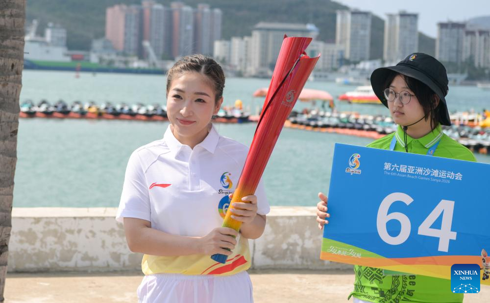 Chinese table tennis player Liu Shiwen holds the torch during the torch relay for the 6th Asian Beach Games Sanya 2026 in Sanya, south China's Hainan Province, March 30, 2026. (Xinhua/Yang Guanyu)