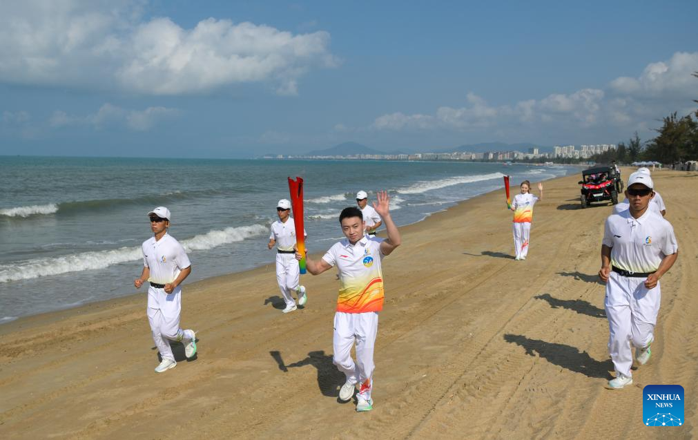 Chinese freestyle aerials skier Qi Guangpu runs holding the torch during the torch relay for the 6th Asian Beach Games Sanya 2026 in Sanya, south China's Hainan Province, March 30, 2026. (Xinhua/Guo Cheng)