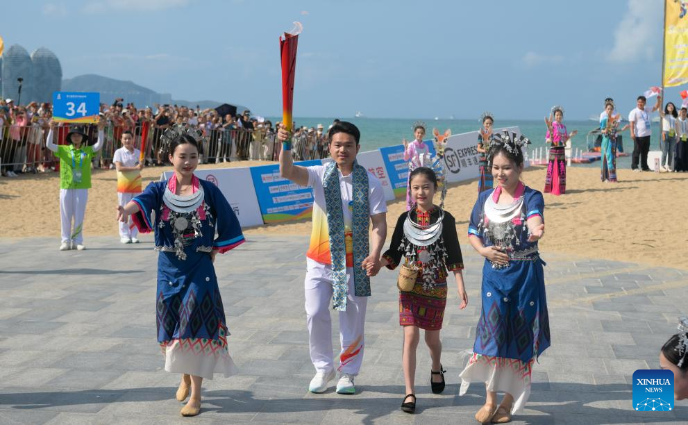 Chinese weightlifter Shi Zhiyong (2nd L) holds the torch during the torch relay for the 6th Asian Beach Games Sanya 2026 in Sanya, south China's Hainan Province, March 30, 2026. (Xinhua/Yang Guanyu)