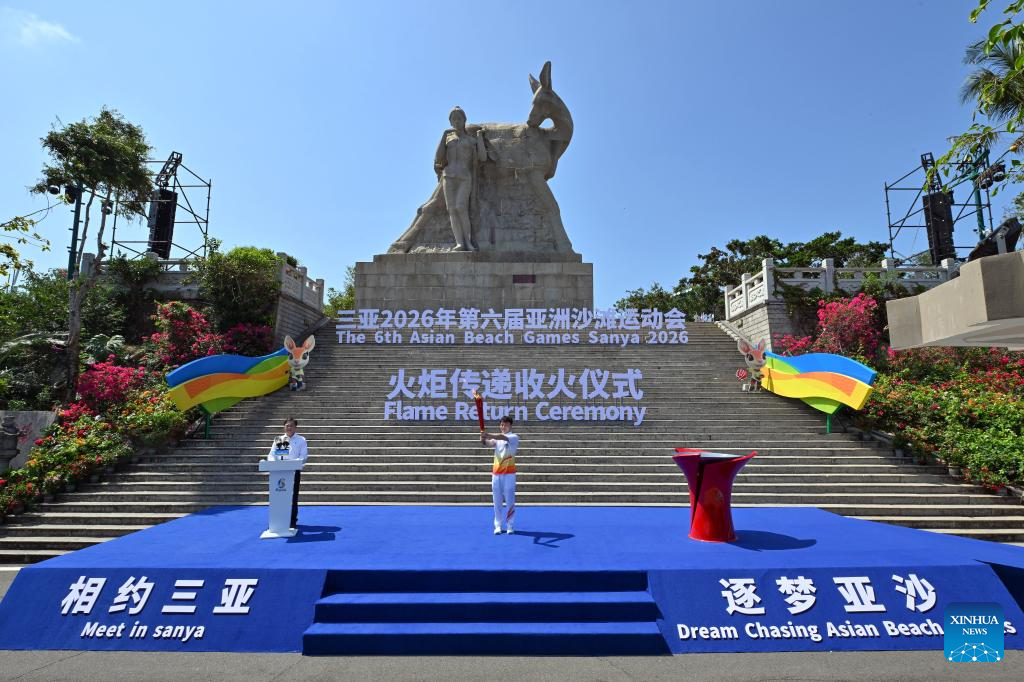 Chinese freestyle aerials skier Qi Guangpu holds the torch during the flame return ceremony of torch relay for the 6th Asian Beach Games Sanya 2026 in Sanya, south China's Hainan Province, March 30, 2026. (Xinhua/Guo Cheng)