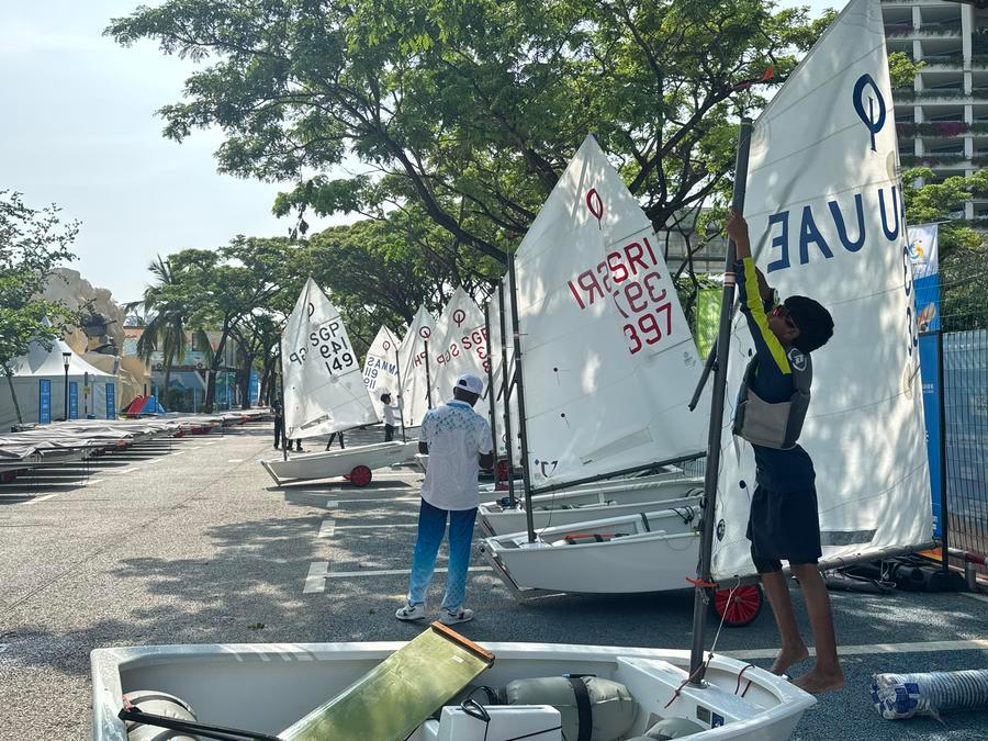 Scenes like this are common at the sailing venue, thanks to the Optimist (OP) and ILCA4 dinghy events, which are open to athletes under 16 and 18 respectively. Despite their tender age, competitors are required to rig their own boats and launch them unaided.