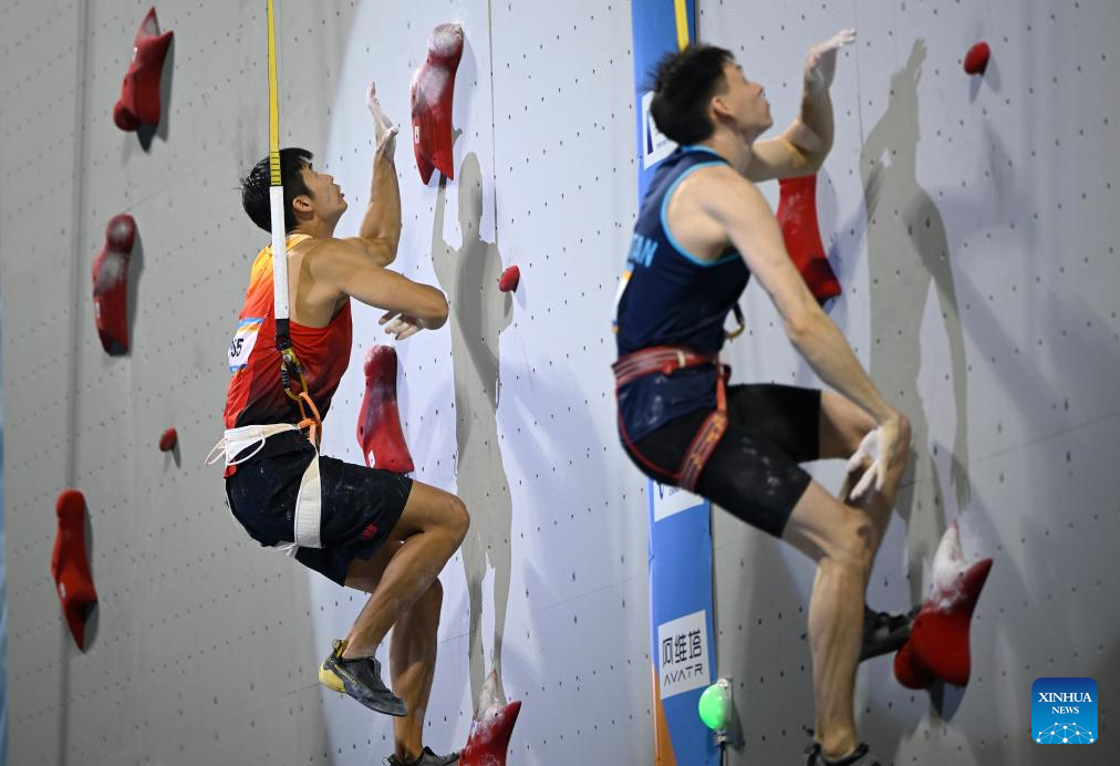 Wu Peng (L) of China competes during the sport climbing (speed) men's individual round of 16 match at the 6th Asian Beach Games in Sanya, south China's Hainan Province, April 28, 2026. (Xinhua/Zhao Zishuo)