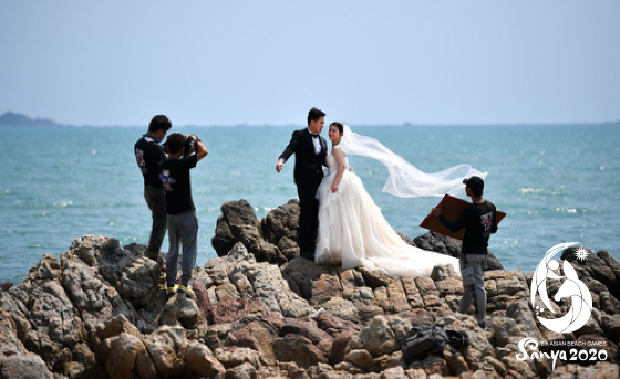 On March 11, the couple take their wedding photos at the Tianya Haijiao Scenic Spot in Sanya.Photo shot by Xinhua News Agency reporter Guo Cheng.