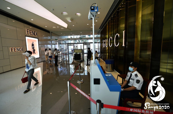 On March 12, tourists walk past the intelligent temperature measurement system at the front gate of Sanya International Duty Free City.Photo shot by Xinhua News Agency reporter Guo Cheng.